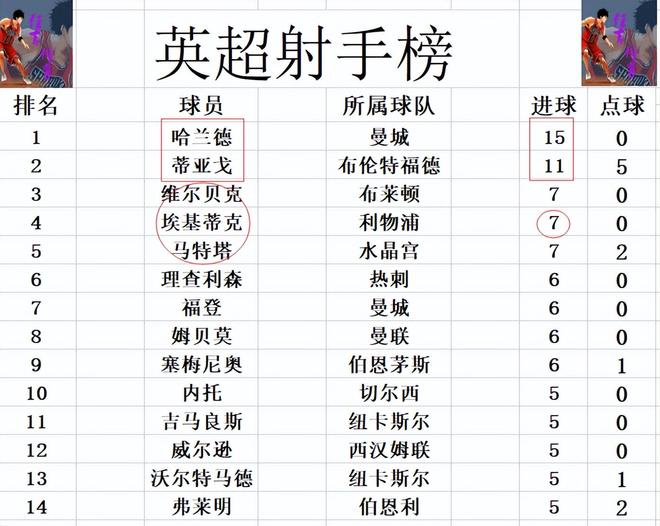 射手榜方面,哈蘭德15球領(lǐng)跑,蒂亞戈11球緊隨其后,?;倏私裉烀烽_二度,追上維爾貝克,馬特塔,7球并列第3。威爾遜,內(nèi)托,吉馬良斯等人5球剛好擠入前十。
